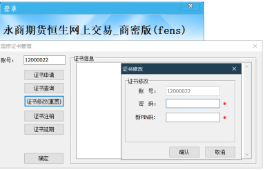 4.证书可以正常使用后,在账号登录界面点击“改PIN”可以进行证书的查询、重置、延期和注销操作;